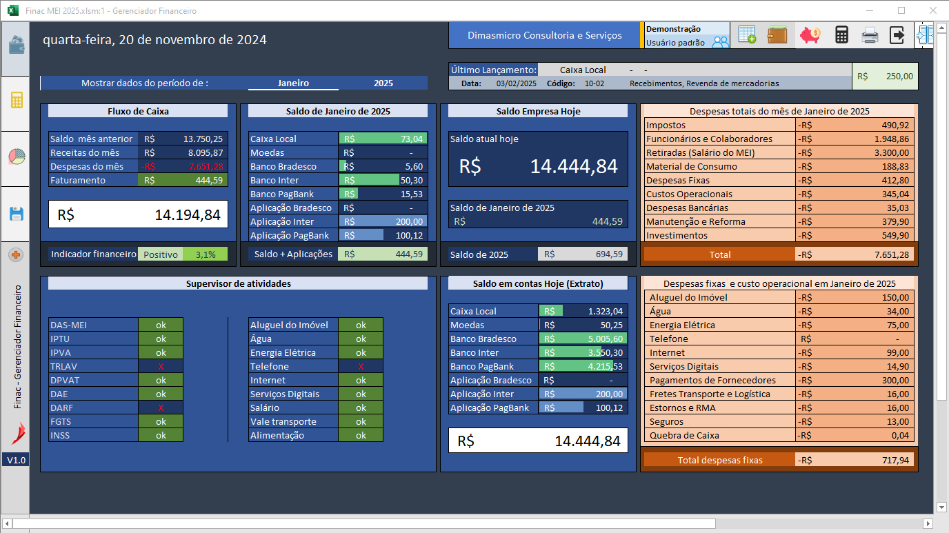 Um gerenciador completo para o MEI (Microempreendedor Individual), totalmente construído em Excel, esta planilha inteligente permite que você faça a gestão financeira completa da sua empresa.Desenvolvido para ser fácil de usar, com uma interface simples e ao mesmo tempo sofisticada, este sistema de planilha inteligente é capaz de ser operado por qualquer pessoa, mesmo que você não tenha conhecimento em Excel, é possivel dominar o programa em apenas algumas horas de uso.